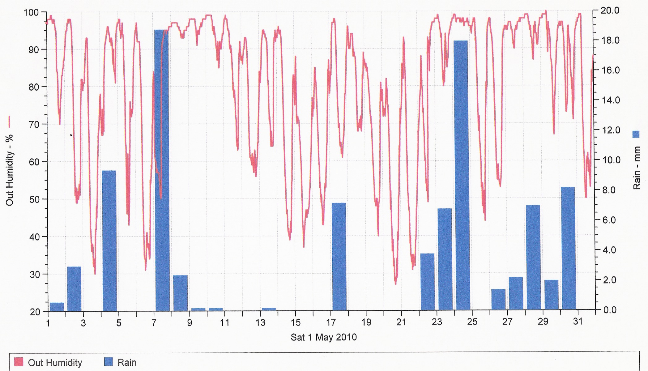 Toukokuun sademäärä oli 91,4 mm sadepäiviä 17 (>0,2 mm) ja kuukauden keskilämpötila 11,2 astetta.